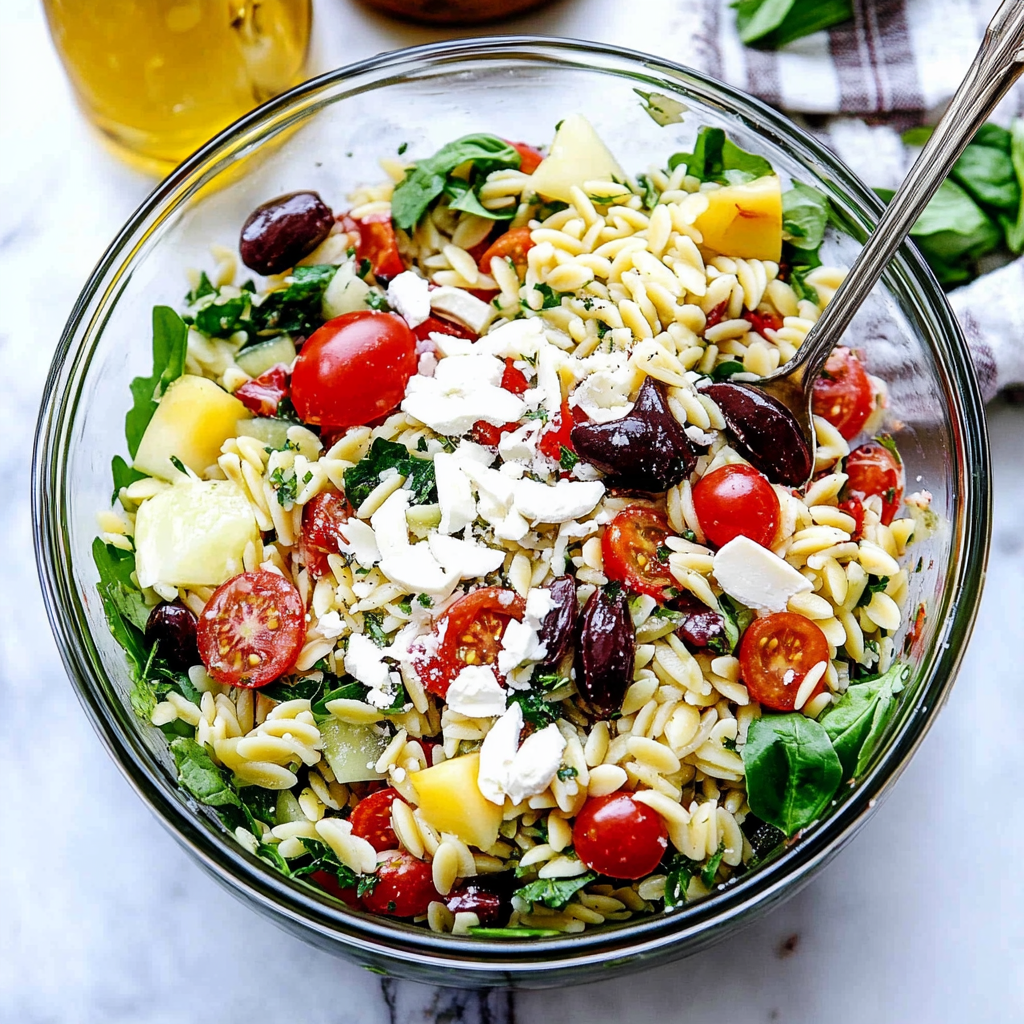 - In a large mixing bowl, combine cooled orzo, spinach, red bell pepper, cucumber, red onion, both types of olives, and half of the crumbled feta.