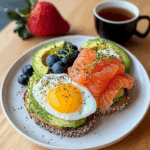 Elevate your breakfast with the delightful Smoked Salmon & Egg Avocado Toast Plate with Fresh Fruit & Tea. This gourmet yet simple dish features crispy toasted bread topped with creamy mashed avocado, perfectly cooked eggs, and savory smoked salmon, all served alongside a vibrant array of fresh fruits and a soothing cup of tea. Perfect for brunch or a quick weekday meal, this colorful plate not only delights the palate but also nourishes the body. Packed with healthy fats, protein, and essential vitamins, it’s a satisfying way to kickstart your day.