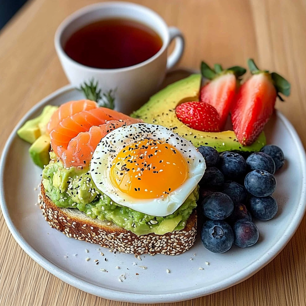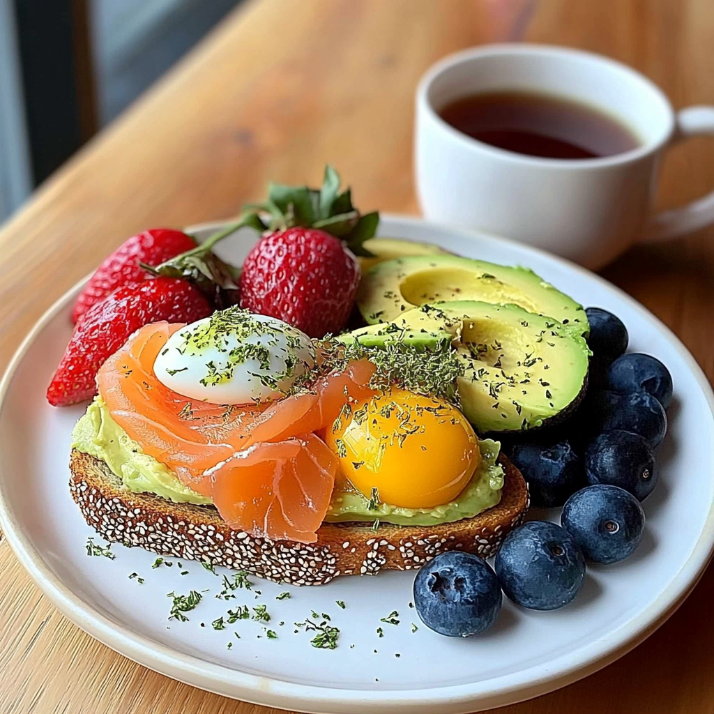 Smoked Salmon & Egg Avocado Toast Plate with Fresh Fruit & Tea is an exquisite breakfast option that elevates your morning routine. This gourmet yet simple dish combines crispy toast, creamy avocado, perfectly fried eggs, and savory smoked salmon, all complemented by fresh fruit and a soothing cup of tea. Perfect for brunch with friends or a quick weekday breakfast, this plate stands out for its vibrant flavors and balanced nutrition.